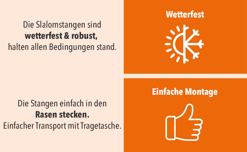 Unsere hochwertigen Slalomstangen bestehen aus widerstandsfähigem, witterungsbeständigem Kunststoff, der besonders leicht & trotzdem stabil ist.